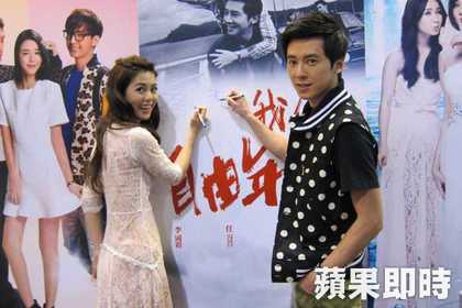 任容萱(左)和李國毅在背板上簽名。娛樂中心/香港攝